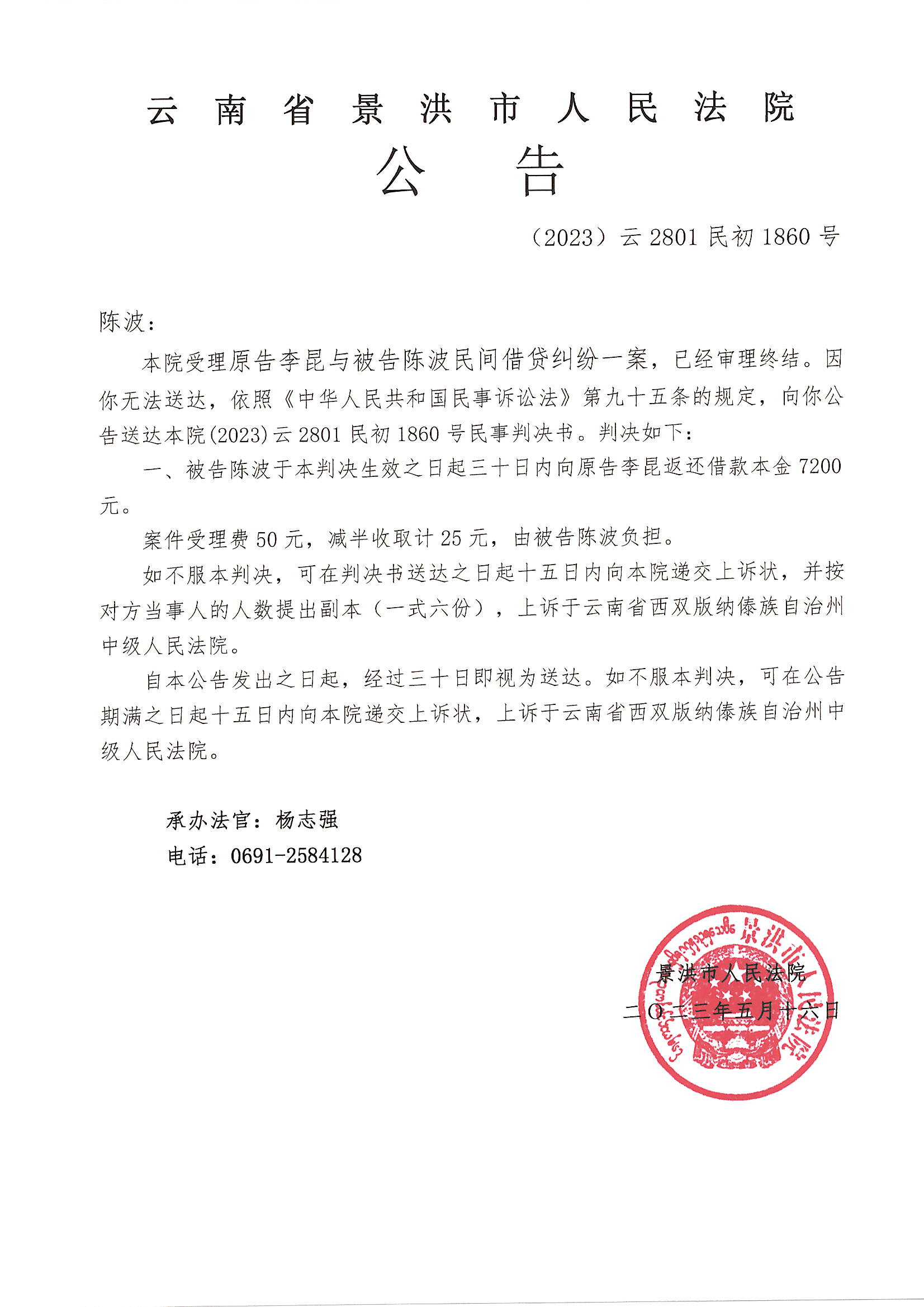 公告判决-陈波(2023)云2801民初1860号