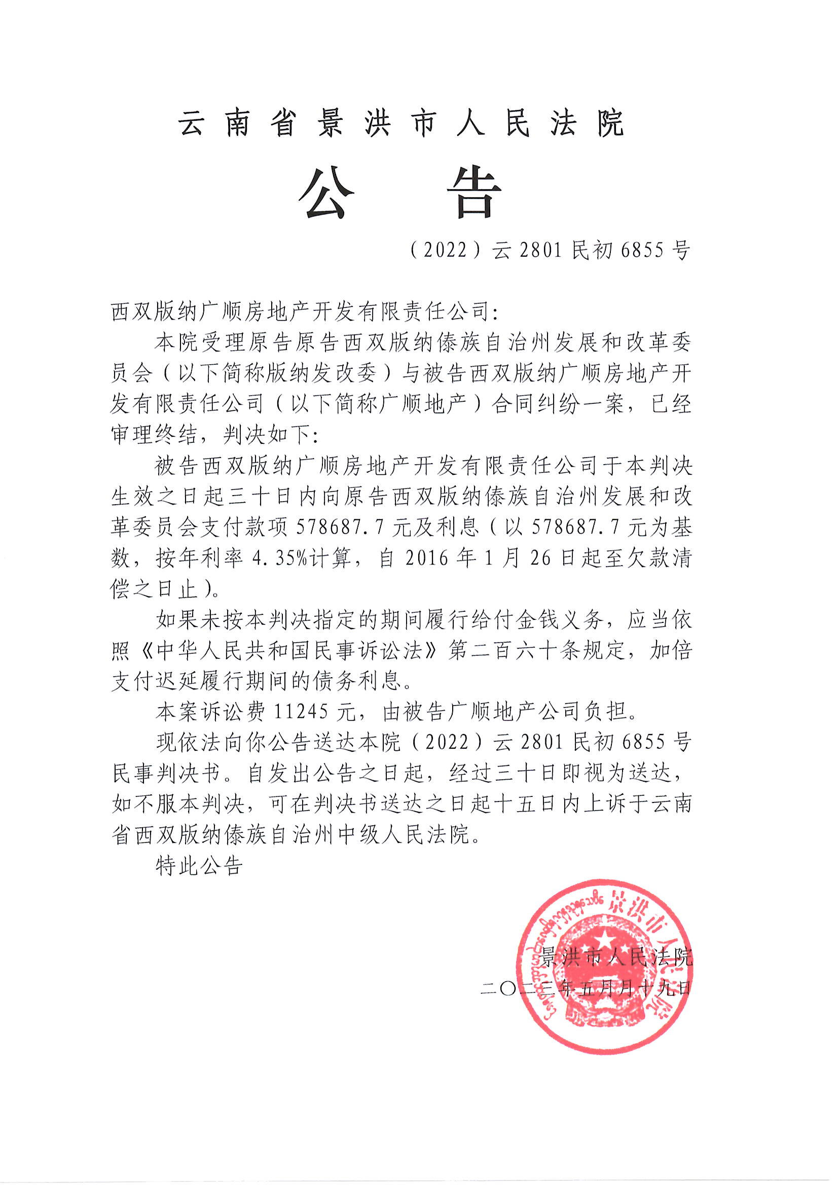 (2022)6855 西双版纳广顺房地产开发有限责任公司 (判决公告)