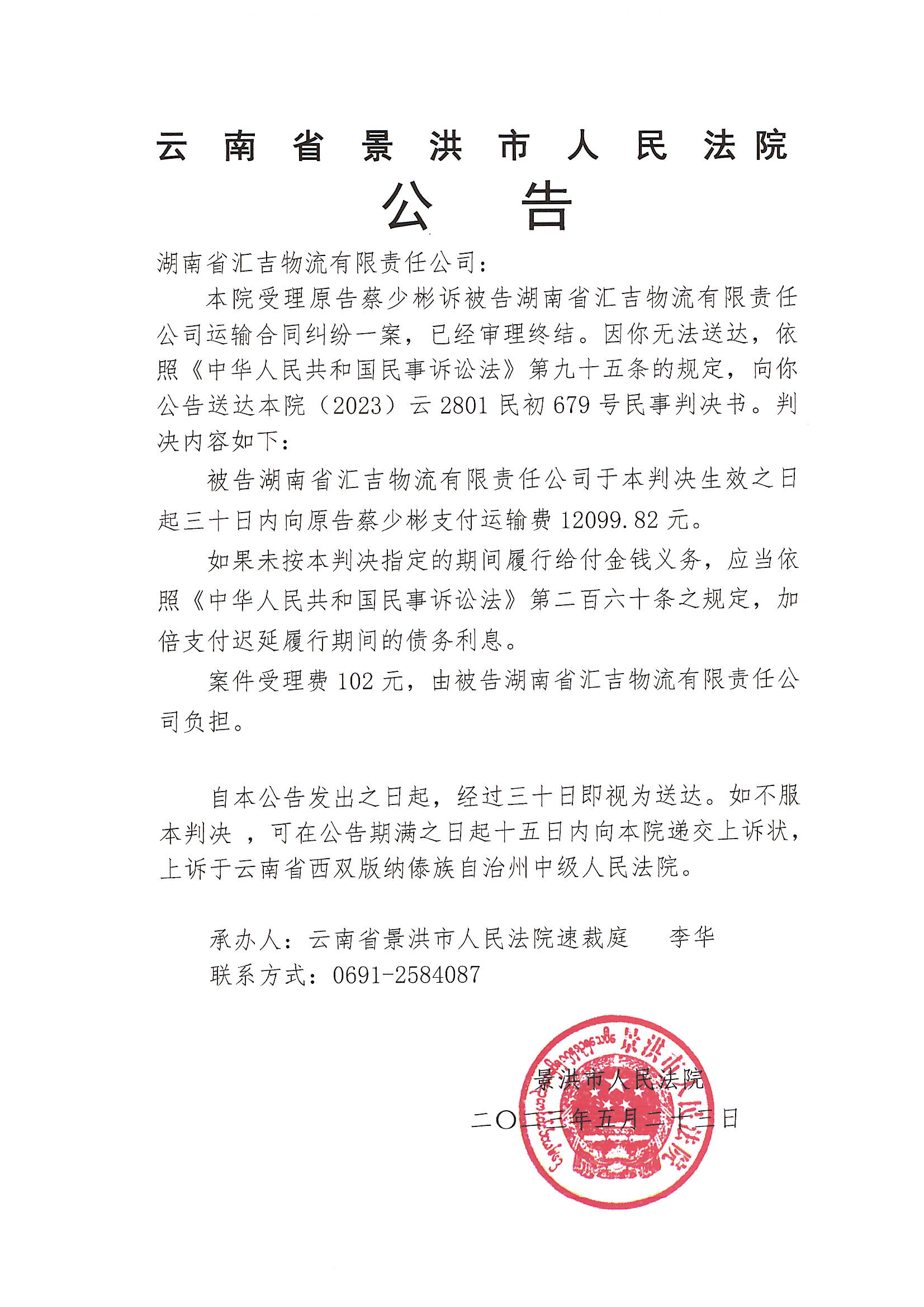 湖南省汇吉物流有限责任公司(判决公告*2,678、679号)
