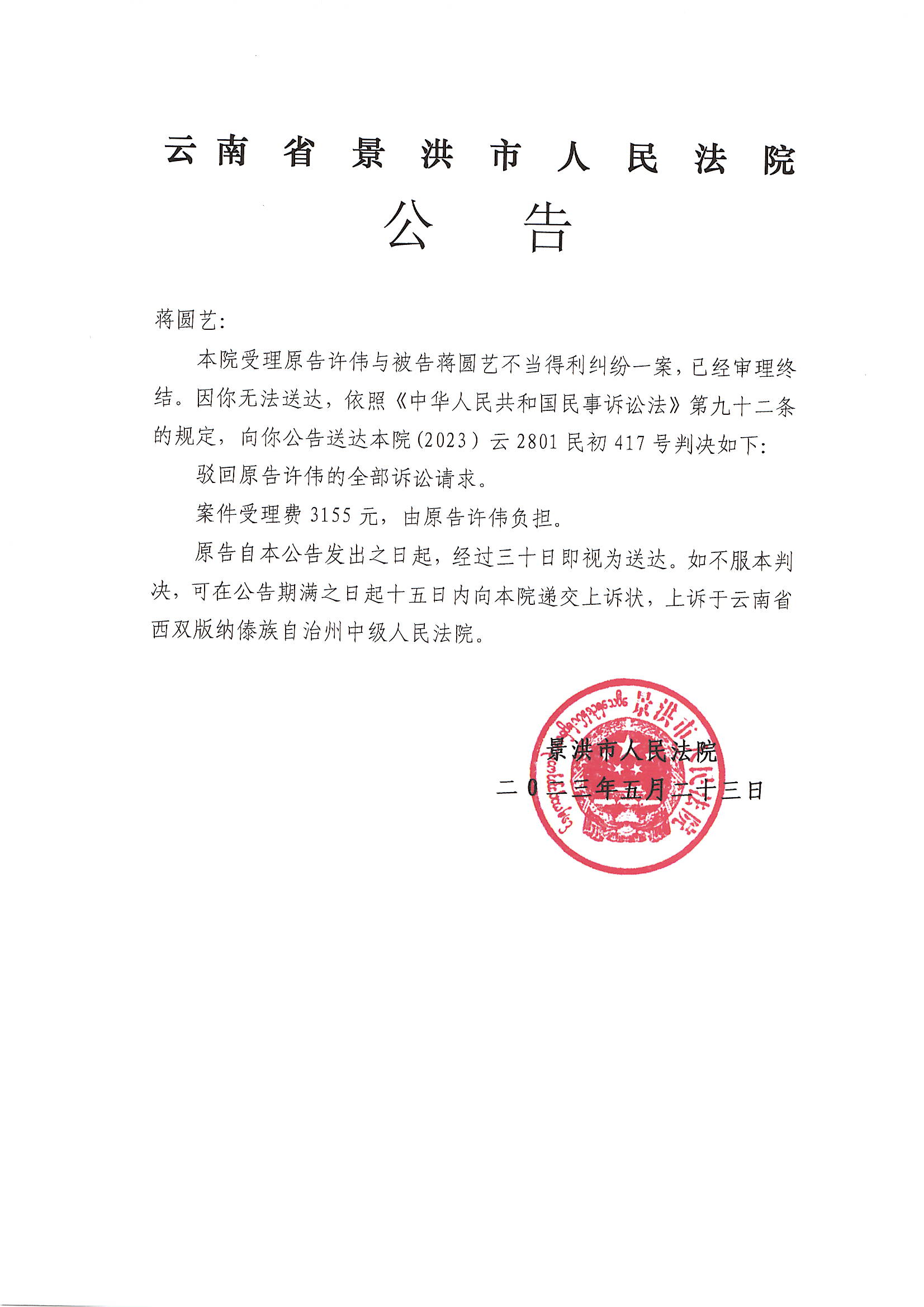 蒋圆艺(判决公告)