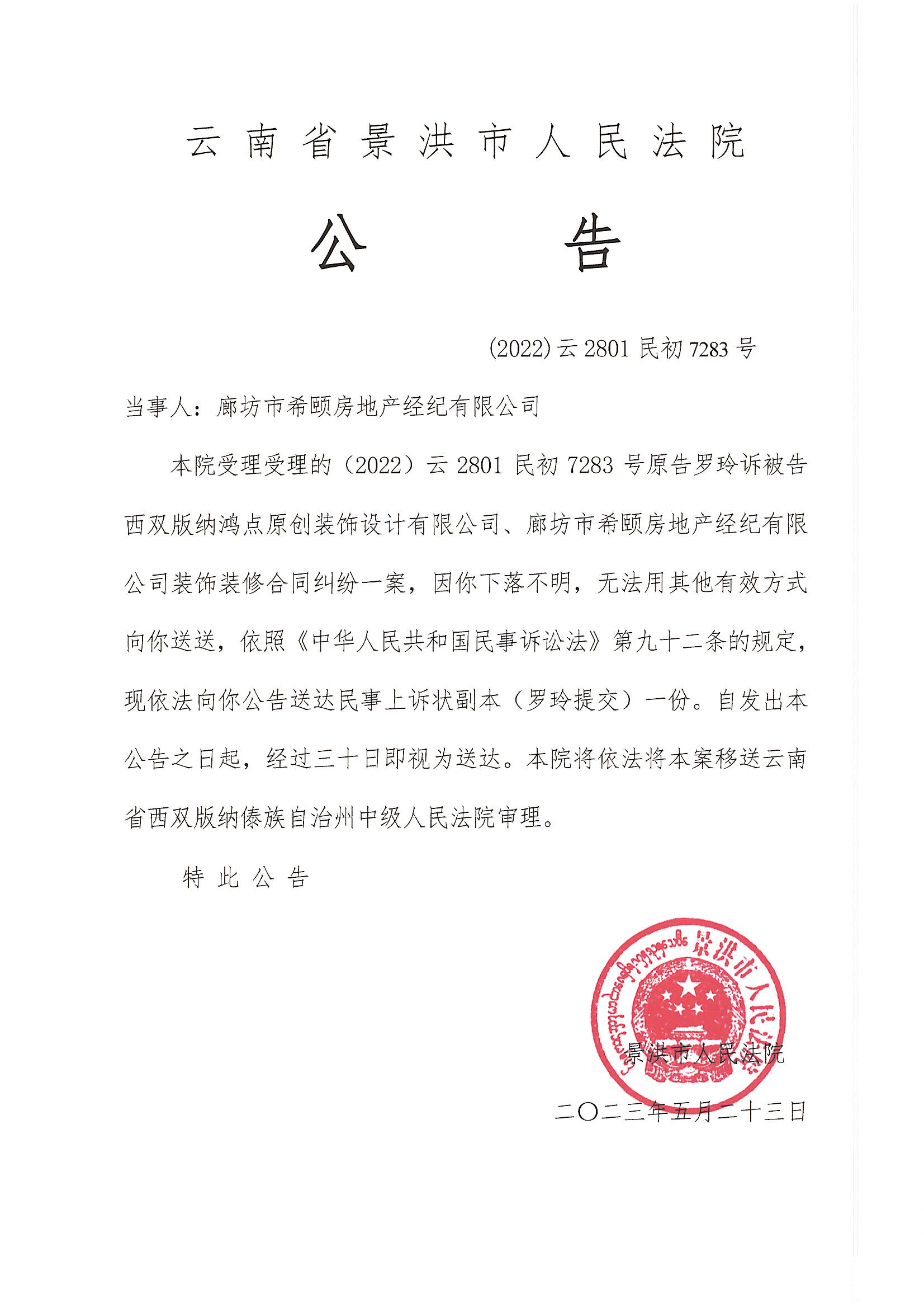 (上诉公告)廊坊市希颐房地产经纪有限公司