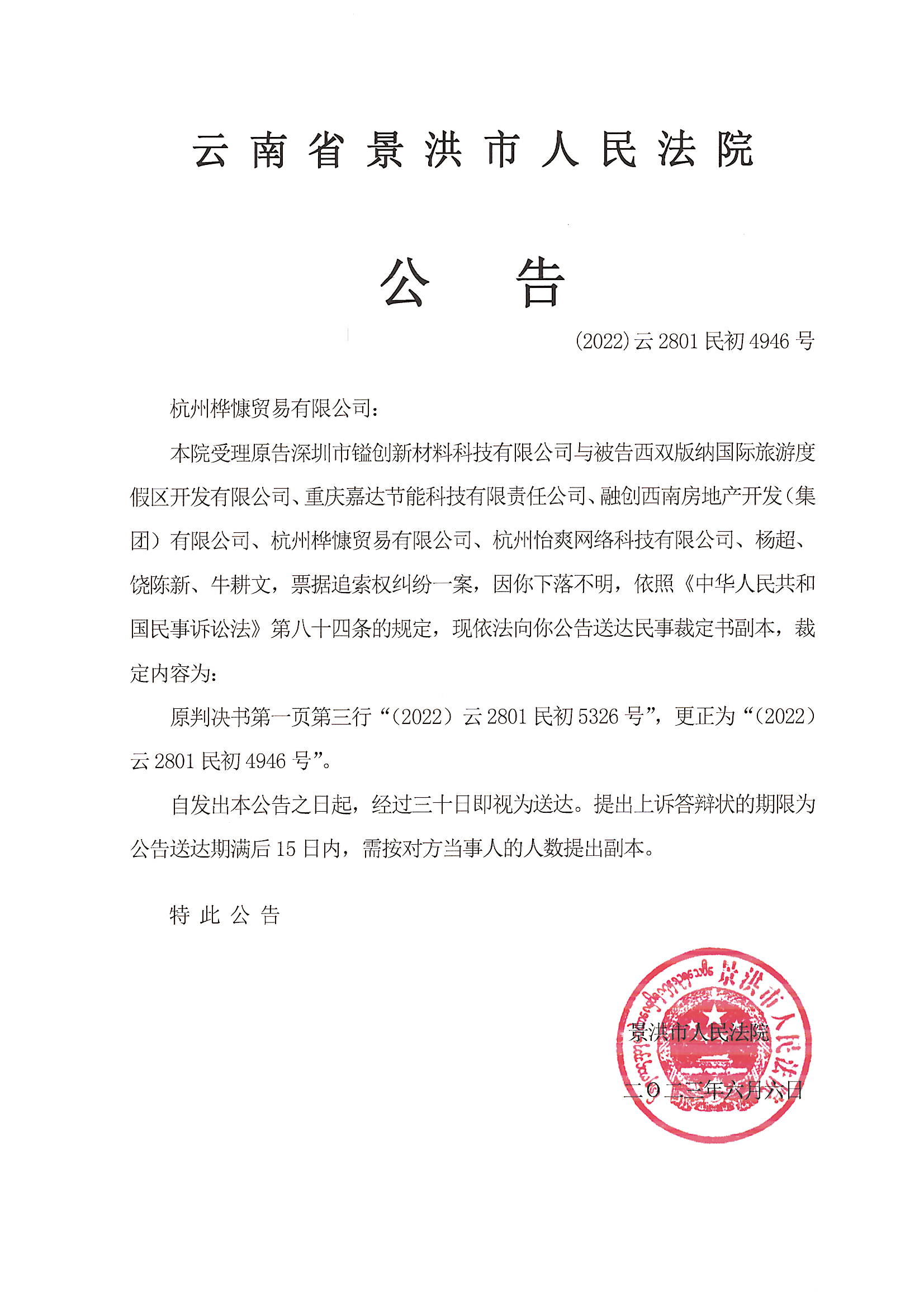 补正裁定书公告(杭州桦慷贸易有限公司)
