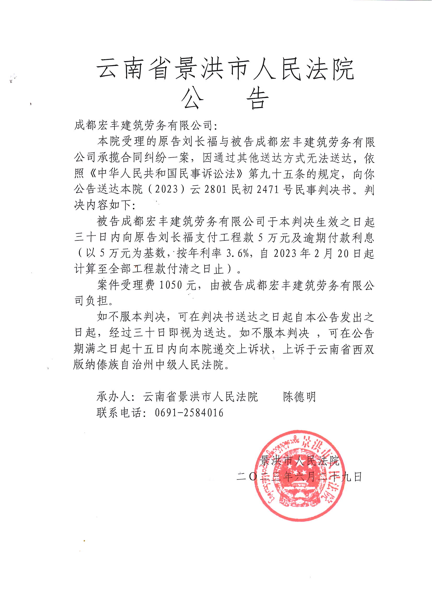 (2023)云2801民初2471号成都宏丰建筑劳务有限公司判决书公告