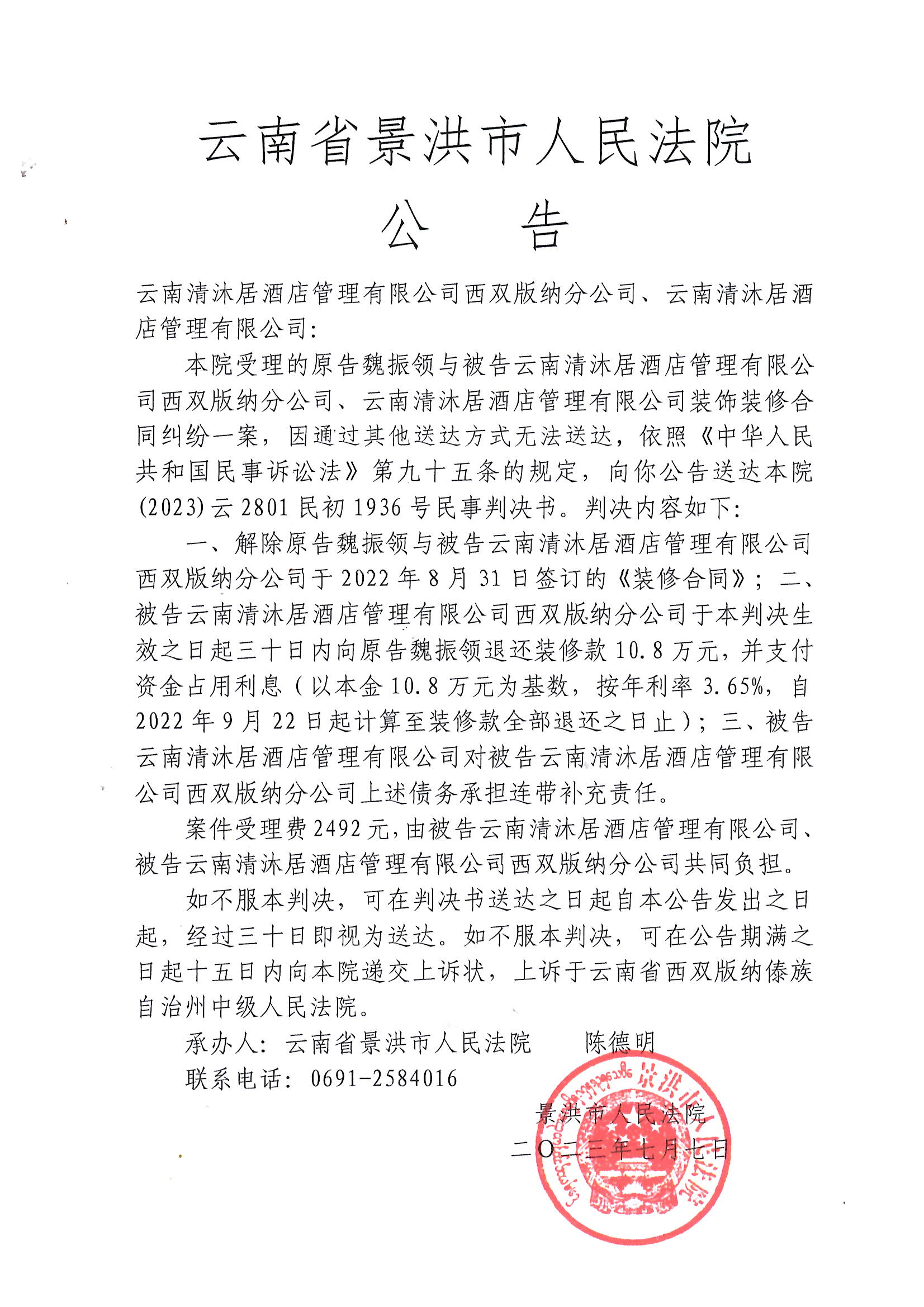 (2023)云2801民初1936号云南清沐居酒店管理有限公司、云南清沐居酒店管理有限公司西双版纳分公司判决书公告