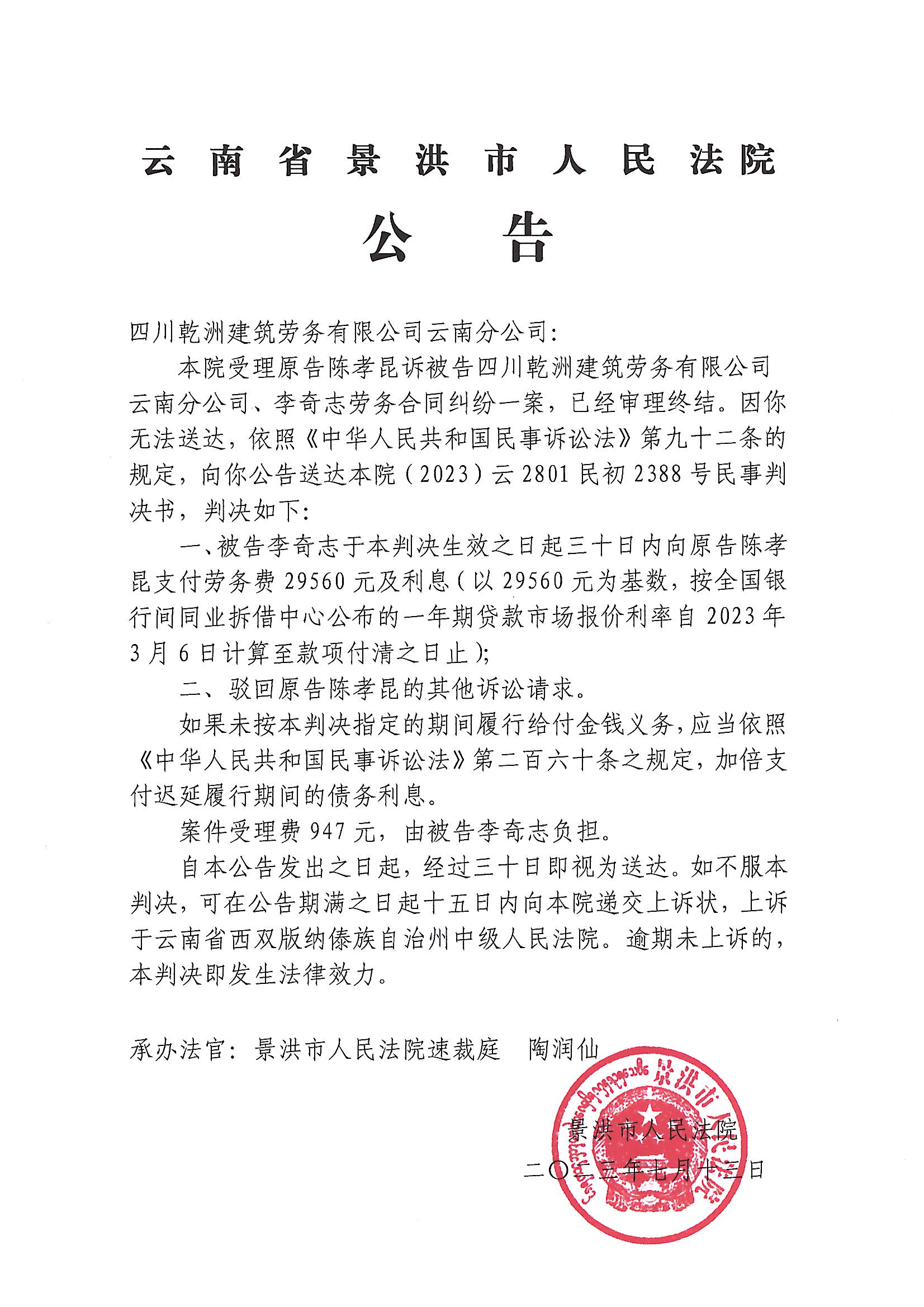 四川乾洲建筑劳务有限公司云南分公司(判决公告)