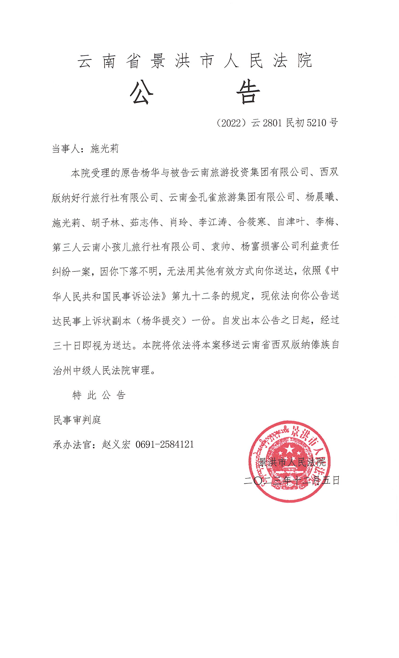施光莉(上诉状公告)(2022)云2801民初5210号