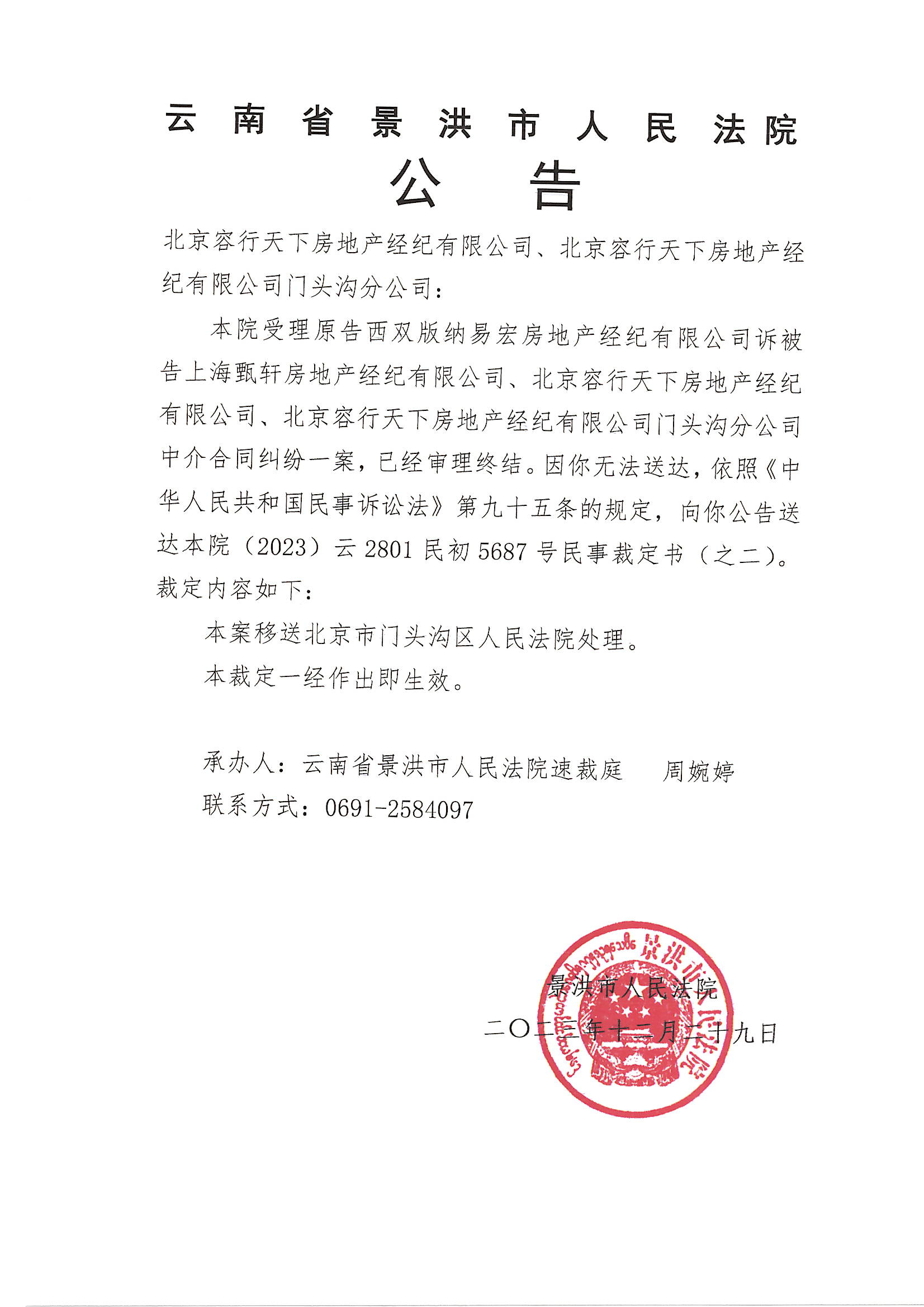 北京容行天下房地产经纪有限公司、北京容行天下房地产经纪有限公司门头沟分公司(5687号裁定书之二公告)