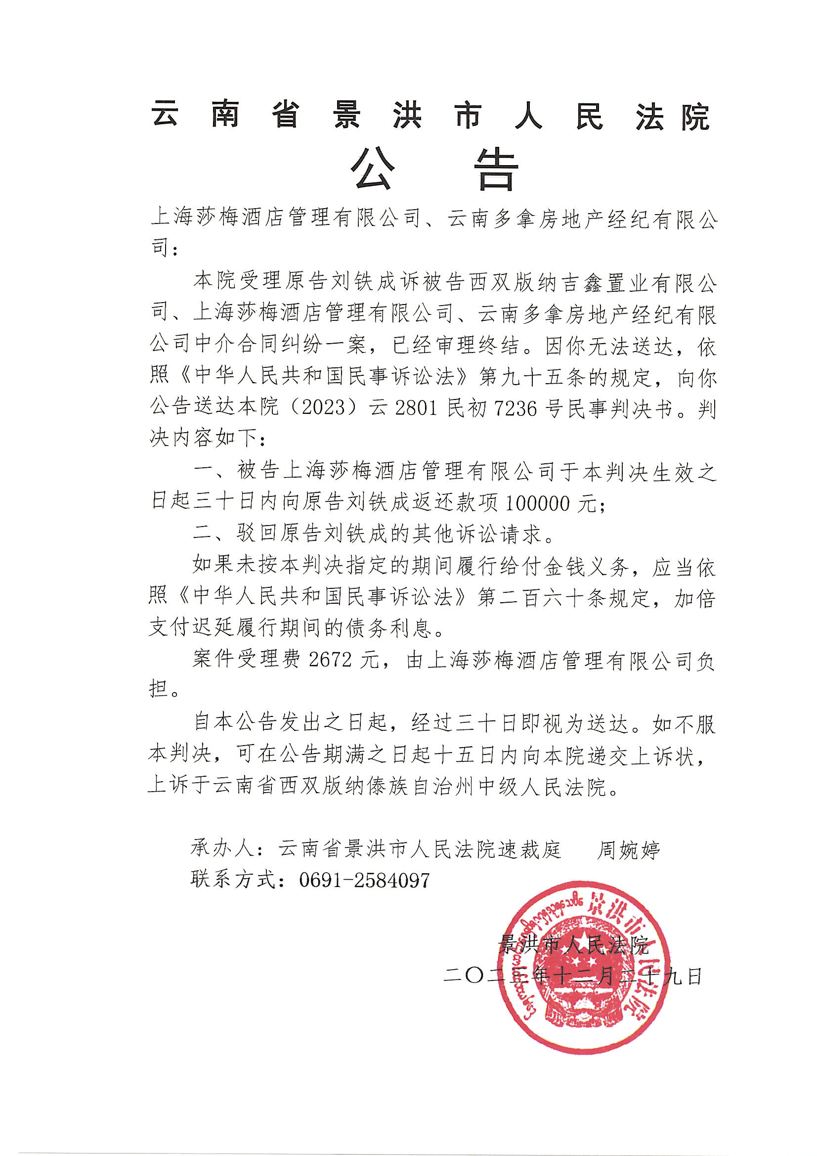 上海莎梅酒店管理有限公司、云南多拿房地产经纪有限公司(7236号判决公告)