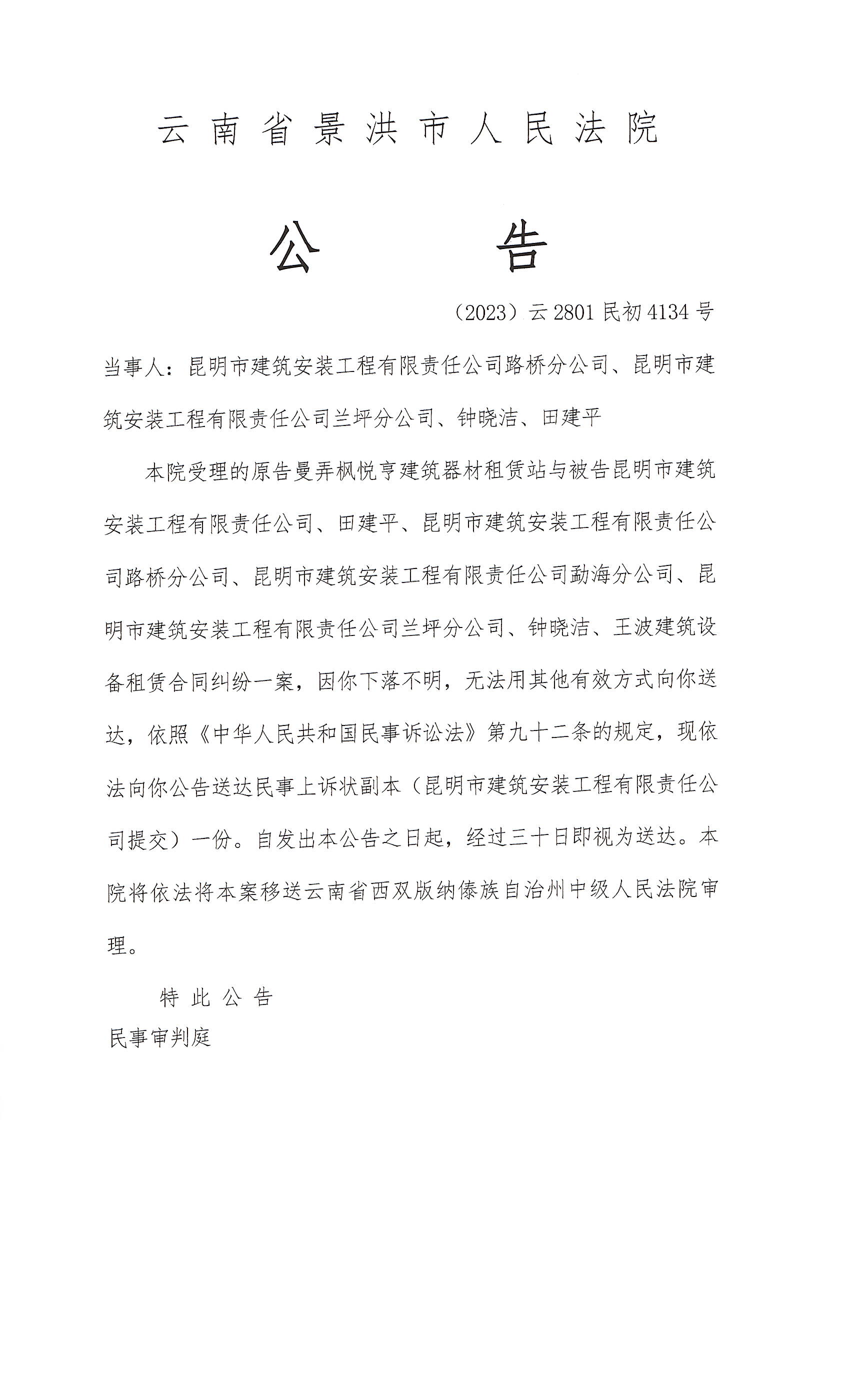 昆明市建筑安装工程有限责任公司路桥分公司、昆明市建筑安装工程有限责任公司兰坪分公司、钟晓洁、田建平(上诉状公告)