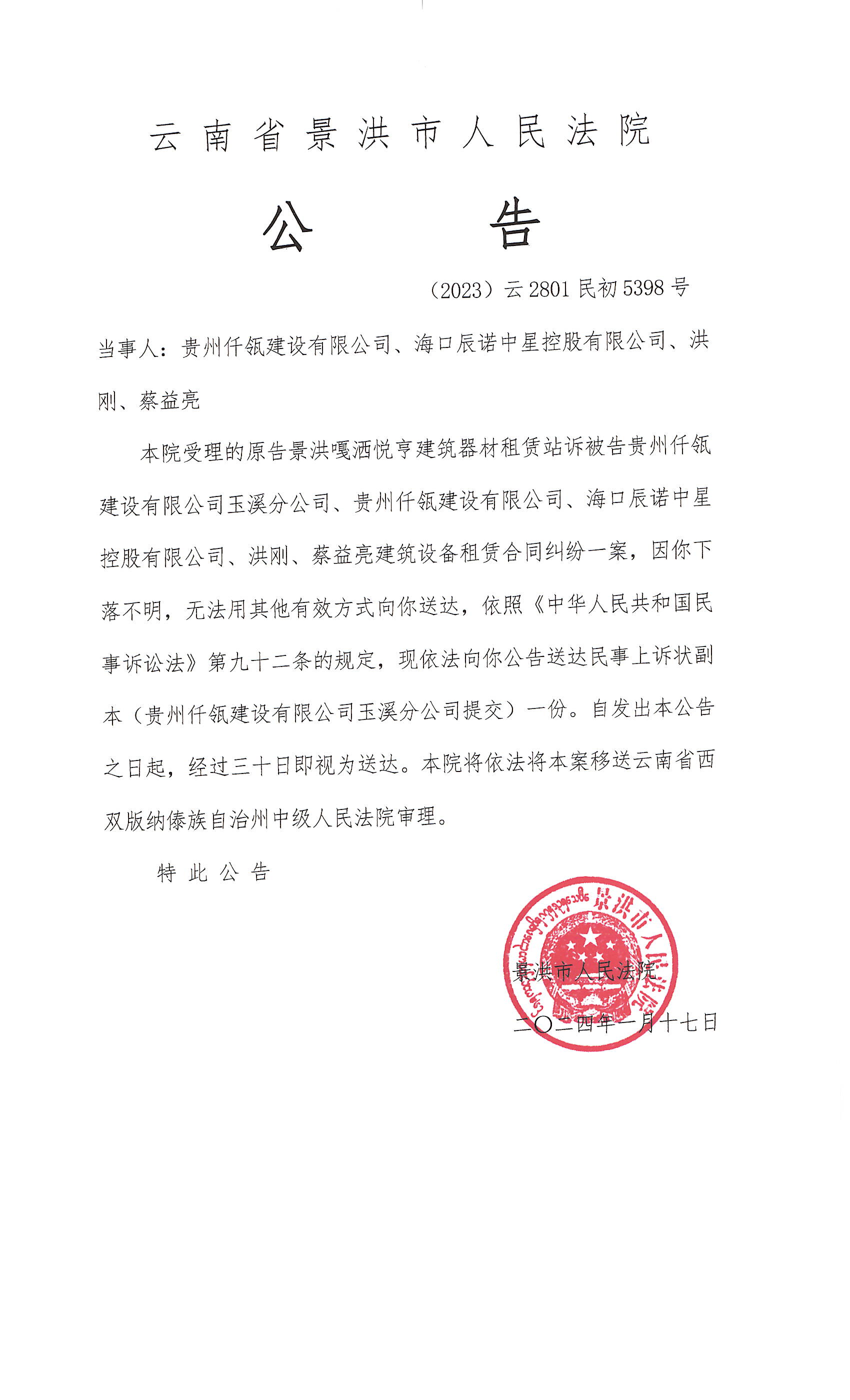 贵州仟瓴建设有限公司、海口辰诺中星控股有限公司、洪刚、蔡益亮(上诉状公告)