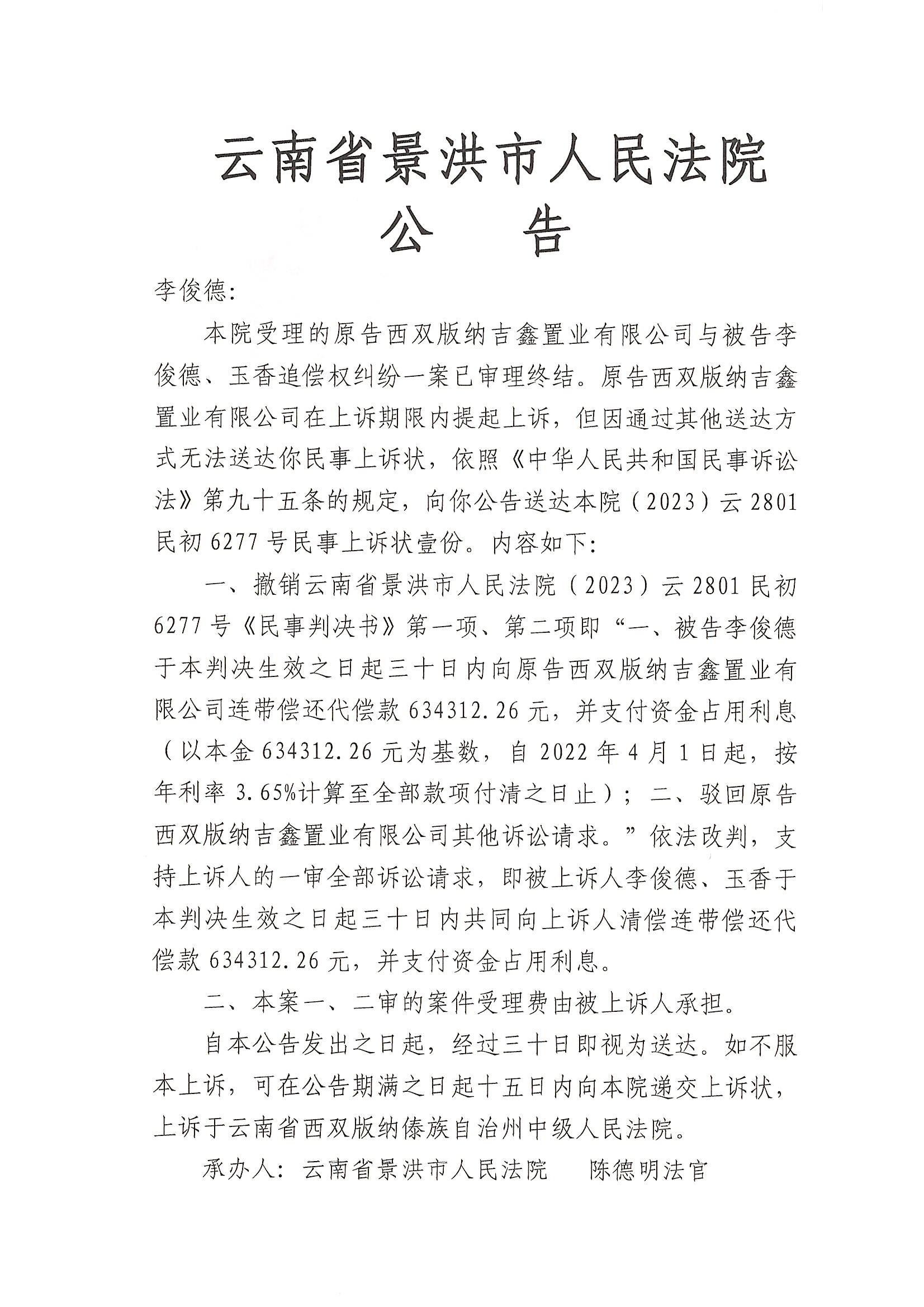 (2023)云2801民初6277号 李俊德 上诉状公告