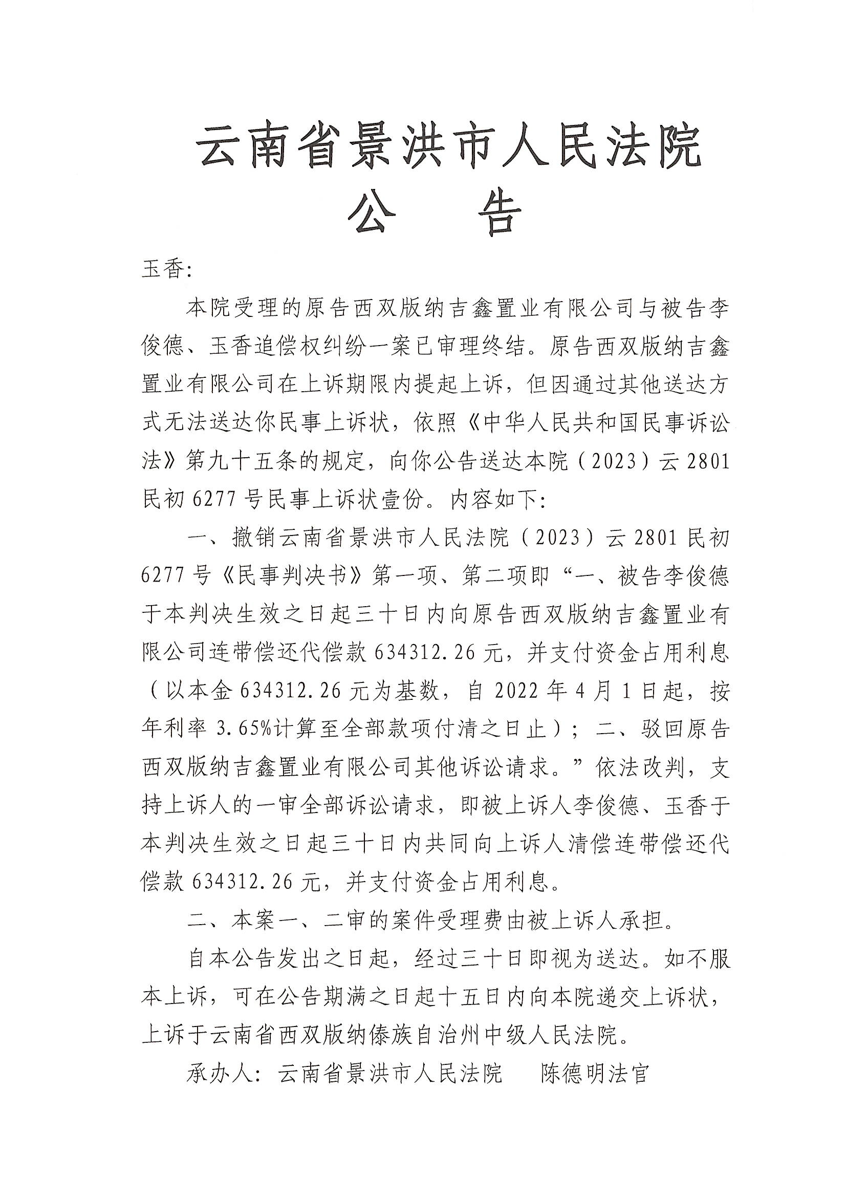 (2023)云2801民初6277号 玉香 上诉状公告