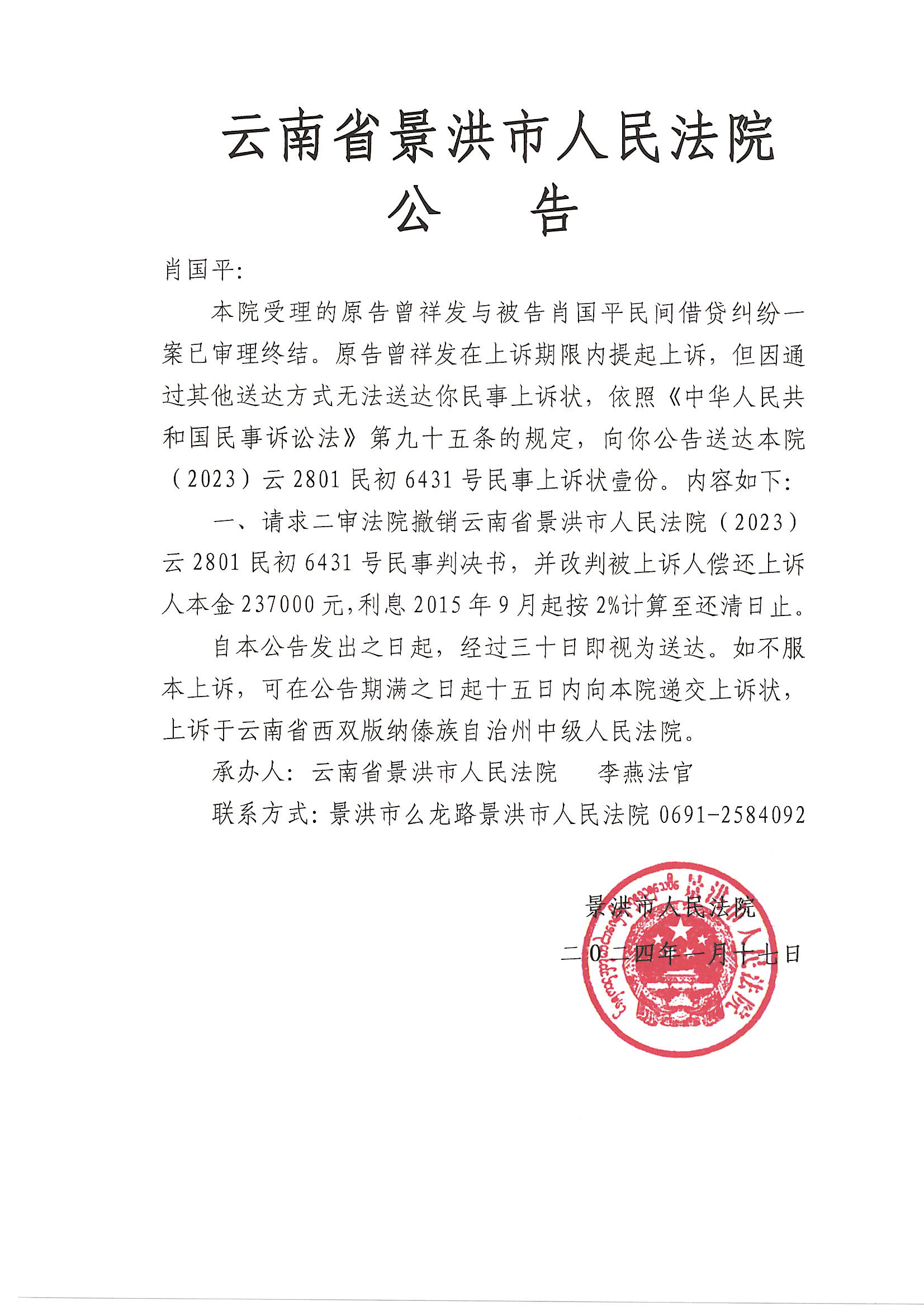 (2023)云2801民初6431号 肖国平 上诉状公告