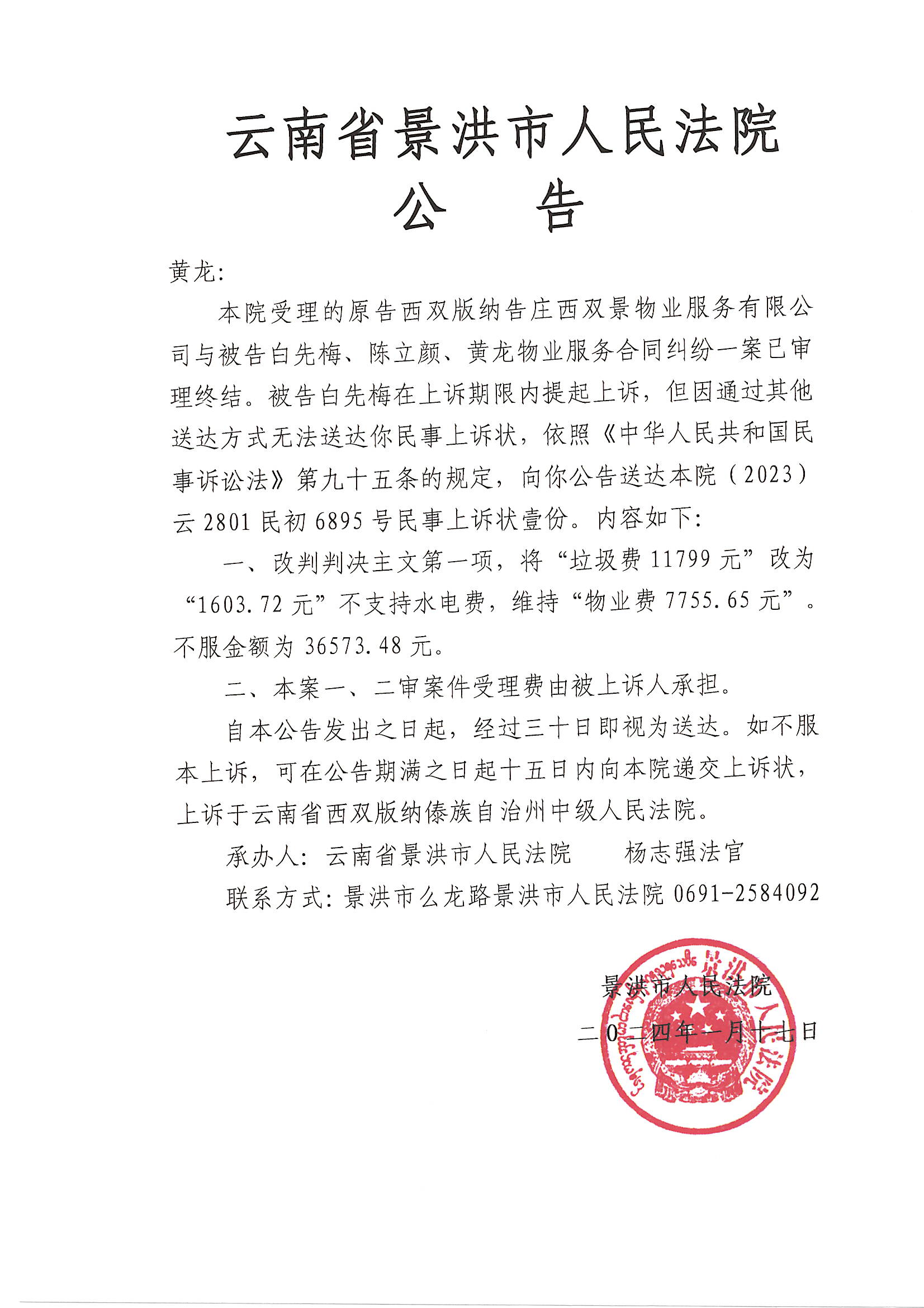 (2023)云2801民初6895号 黄龙 上诉状公告