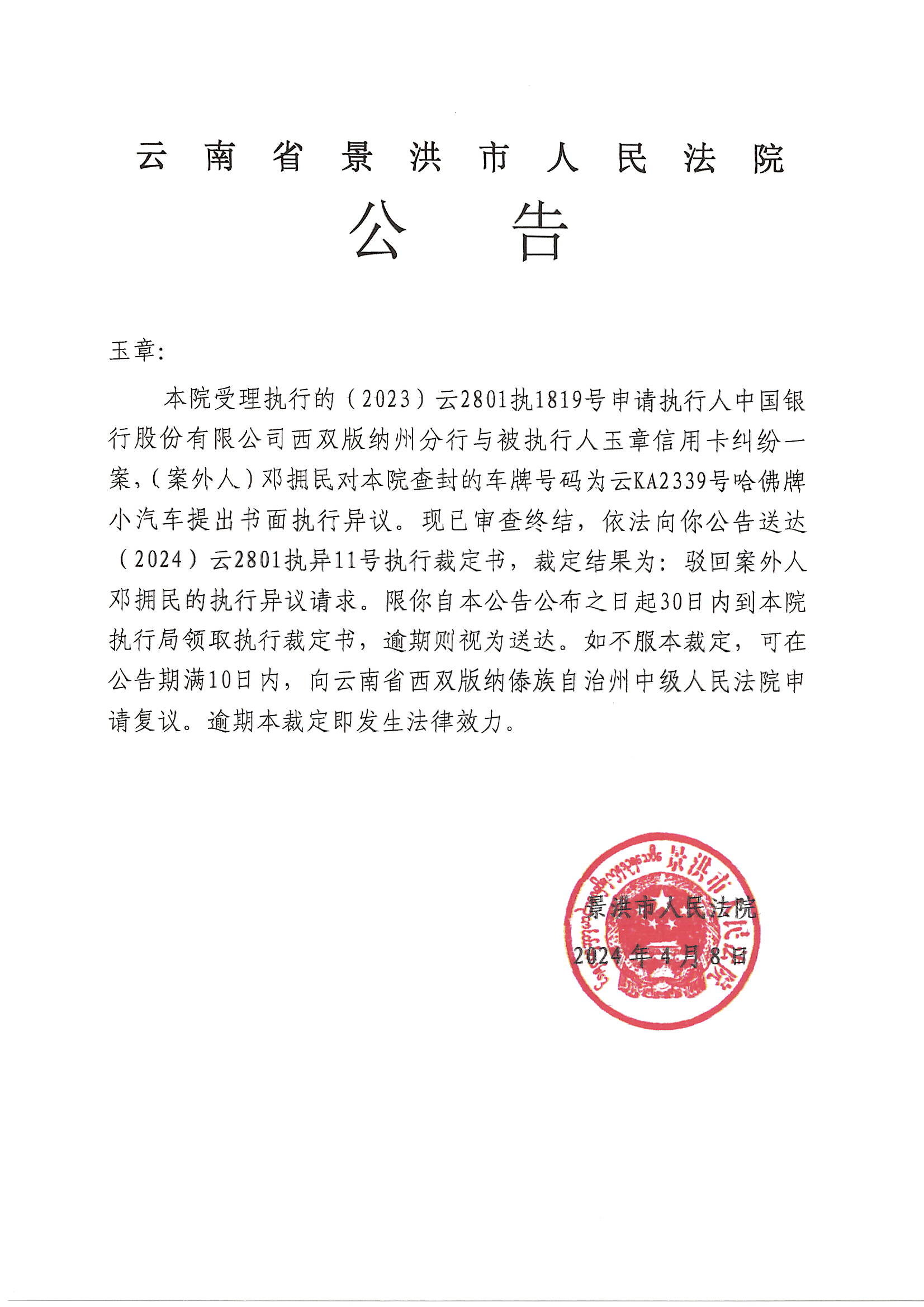 玉章(执异裁定公告)